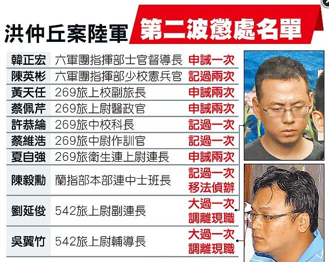 其中包括家属先前质疑未列入第一波惩处名单的269旅副旅长黄天任上校、542旅部连副连长刘延俊中尉,及在洪仲丘悔过期间实施体能训练的兰指部班长陈毅勋中士。