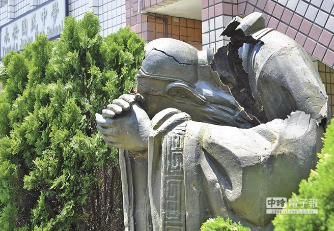 校方14日接获通报,返回校园清查财产损失,发现大面积铁皮落于大门川堂前,20棵包含椰子树、黑板树等遭铁皮压垮。矗立校园的孔子雕像惨遭断头,手上还诡异地捧着头颅。