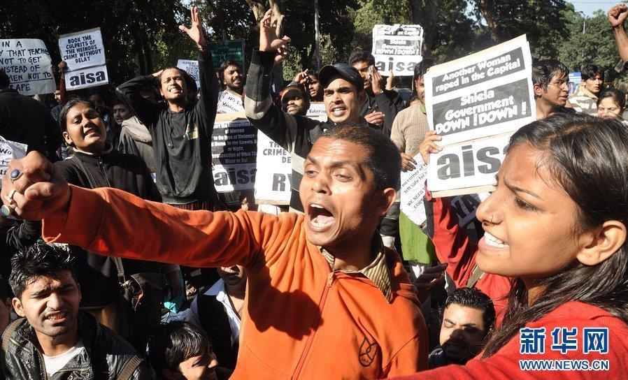 2012年12月19日,印度新德里,印度人民党的女成员游行谴责女生在公交车上被轮奸的事件。2012年12月16日晚一名23岁的医学女生在德里南部与其男性朋友一起乘公交时,车上包括司机在内的7名男子对两人进行殴打,并轮奸了女生,之后将二人扔出公交车逃逸。图片来源:新华网