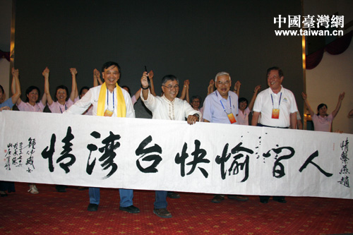 压轴的第四车表演的节目结束后,演员们打出手写横幅祝福大家(中国台湾网 芜同 摄)