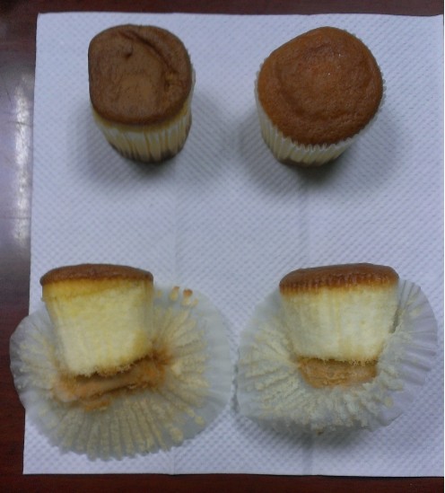 他说,他买了一袋一样的杯子蛋糕,“接着就是老少对决了,如果用有效日期作标题的话,就是“2012.08.27 VS 2013.07.22”,光看外表,老了一岁的蛋糕有点扁,颜色比较不那么鲜艳,但是把下面掰开一看,里面都是很鲜嫩的!”