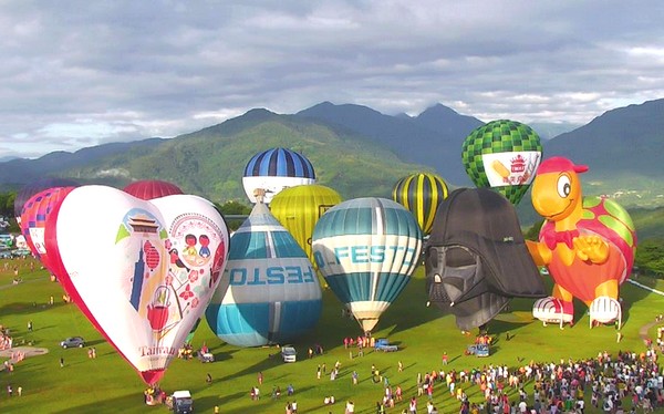 鹿野高台今天人声鼎沸,包括黑武士、乌龟、乳牛等造型球都齐聚一堂。(图片来自台湾“中广新闻网”)