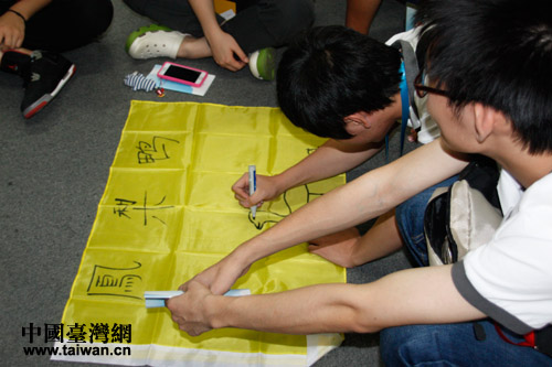 “2013年海峡两岸红十字青少年夏令营”营员们按大陆、台湾学生各一半分成四个小组,分别取名为“凤梨鸭”、“V2队”、“心海连”和“心绿队”。“凤梨鸭”队员们绘制队旗。(中国台湾网 郜利敏 摄)