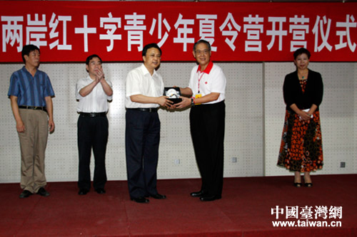 中国红十字会副会长郭长江(左三)和台湾红十字组织理事赵天星(左四)互送礼物。(中国台湾网 郜利敏 摄)