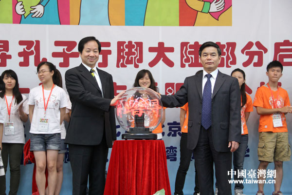 27日上午,“2013Hoping·Download第四届青年踏寻孔子行脚”大陆部分启动仪式暨两岸大学生志愿服务论坛在北京师范大学举行。图为北京师范大学校长董奇(右)与台湾师范大学校长张恩国共同启动仪式。(中国台湾网 普燕 摄)