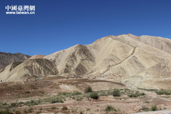“海峡两岸记者西北行”联合采访团参访张掖丹霞国家地质公园,感受中国第一七彩丘陵神奇景观。(中国台湾网 王文英 摄)