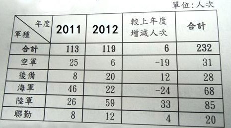 综合台湾媒体报道,台军官兵2012年违纪案件23096人次,依台军预算员额21万余人计算,违纪比率达11%,较往年增加许多。其中,士兵部分2010年违纪的仅944人次,2012则年增加到3253人次,增幅达244%;士官部分从6644人次增加到8779人次;军官部分从9267人次,增加到11000人次。将官部分则从86人次减为64人次。