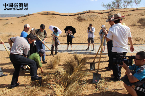 两岸记者团团长杨毅亲自制作茅草方格(中国台湾网 王文英 摄)