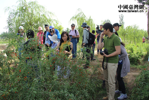 两岸记者在中宁品尝新鲜枸杞。(中国台湾网 王文英 摄)