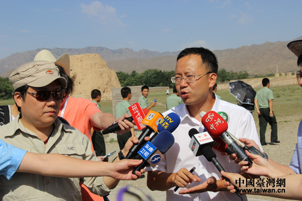 西夏博物馆馆长在三号陵园接受两岸记者采访。(中国台湾网 王文英 摄)