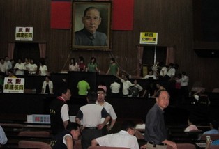 中国台湾网8月2日消息 据台湾“今日新闻网”报道,台湾“立法院临时会”原定2日处理“核四公投案”,民进党籍“立委”1日傍晚占据“议场主席台”,国民党籍“立委”2日晨4时30分强攻,蓝、绿“立委”爆发第一波肢体冲突后在台上台下对峙。