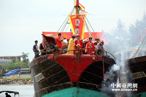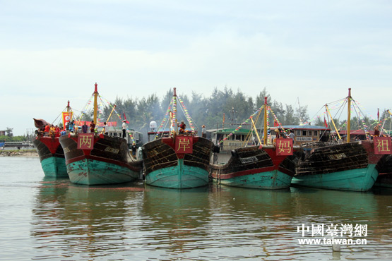 鞭炮响起,祭海仪式开始,海南琼海潭门渔港数百艘渔船驶出港口赴南海捕鱼。(中国台湾网 李丹 摄)
