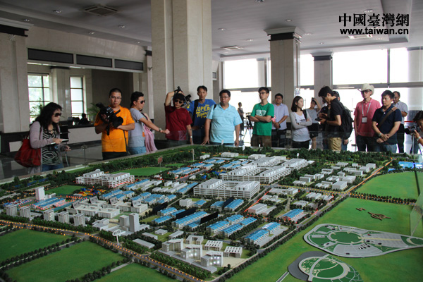 两岸记者参观西安综合保锐区沙盘。(中国台湾网 王文英 摄)