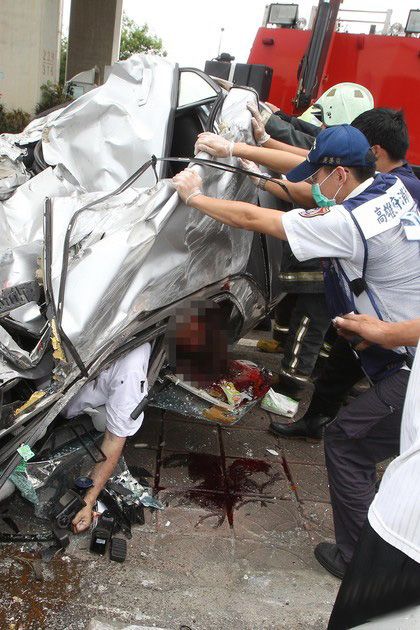 台湾一对情侣驾车被撞身亡,车体扭曲如麻花。(图片取自台媒)