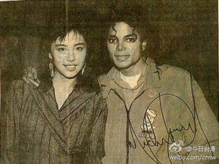 王祖贤与迈克尔杰克逊合影旧照。(图片取自“今日台湾”微博)