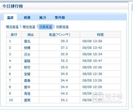 台湾各地8日前半天高温记录(来源:台湾“中国时报电子版”)