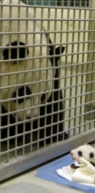 此时,“圆仔”彷佛知道妈妈就在面前,虽然眼睛还未睁开,却突然开始哇哇大叫,听到了“圆仔”的叫声,“圆圆”也边扒着铁栏杆边低鸣吼叫,不时伸出温柔的舌头舔拭“圆仔”,在场的保育员惊呼,“从来没有听圆圆这样叫过”,这是母爱的流露。(中国台湾网 李帅)
