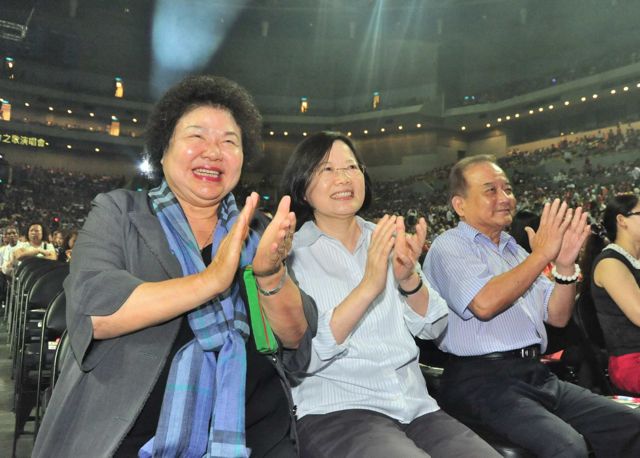 高雄市长陈菊(左)、民进党前主席蔡英文观赏詹雅雯演唱会。(图片来自台媒)