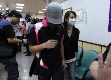 何江忠紧抓着妻子的手穿着便服到庭。(图片来自台媒)