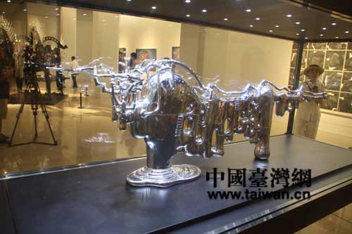 台湾艺术家席时斌的雕塑“模型:阿湿波”以不锈钢、铜、木料、等制作(中国台湾网 芜同 摄)