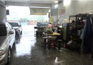 大水淹入,卖肉粽的店家在水中做生意。(图片来自台媒)