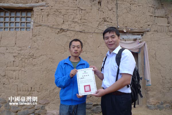 顶新公益基金会张建利经理前往贫困生吕鹏伟家中发放奖学金(中国台湾网 李徽 摄)