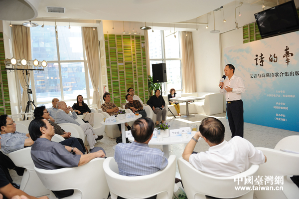 艾青与高瑛诗歌合集《诗的牵手》出版座谈会在京举行。中国诗歌学会、作家出版社、《文艺报》、《诗刊》、《时尚》杂志社等有关单位负责人,著名诗人、诗歌评论家屠岸、峭岩、张同吾、朱先树等数十人出席了座谈会。(中国台湾网 普燕 摄)