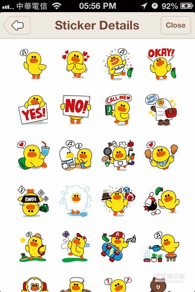 通讯软件LINE的黄色小鸭Sally贴图。(来源:台湾《中国时报》)