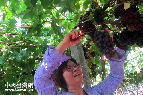 参访团成员在兵农葡萄庄园体验采摘。(中国台湾网 王伟 摄)