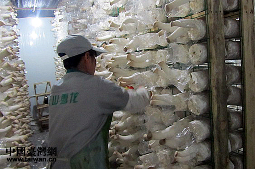 工人在采摘食用菌。(中国台湾网 王伟 摄)