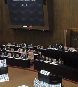 “立法院”上午“国是论坛”后,“立法院长”王金平宣布开会,民进党、台联党“立委”打出抗议标语,国民党团见状请求协商。王金平随即宣布休息协商,朝野协商到中午未有结果,到了下午3时半朝野再度进行协商。