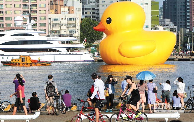 中国台湾网9月18日消息 据台湾“中时电子报”报道,风靡全球,疗愈人心的小黄鸭,19日中秋节开始悠游高雄港光荣码头,为期1个月。这只高18米、宽25米,身形是目前亚洲最大、全世界第2大的小鸭,首度在台展出。因为可能碰上台风“天兔”,主办单位已有备案,遇台风警报会将小鸭泄气后,移至岸上保护。