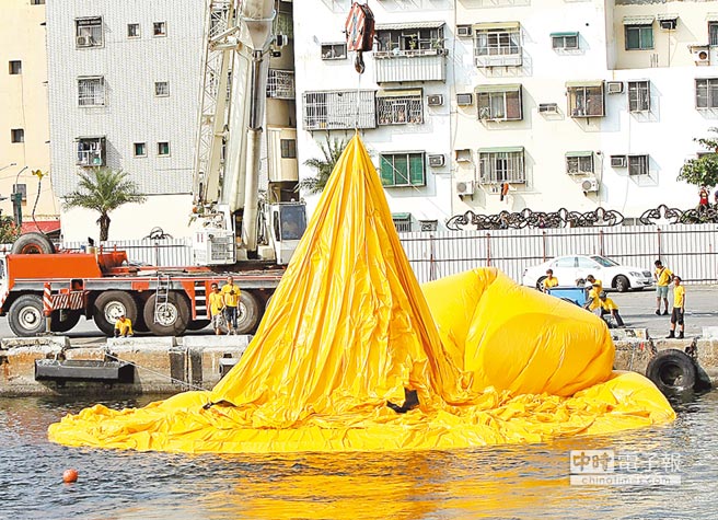 小黄鸭在海面上进行充气。(图片来自台媒)