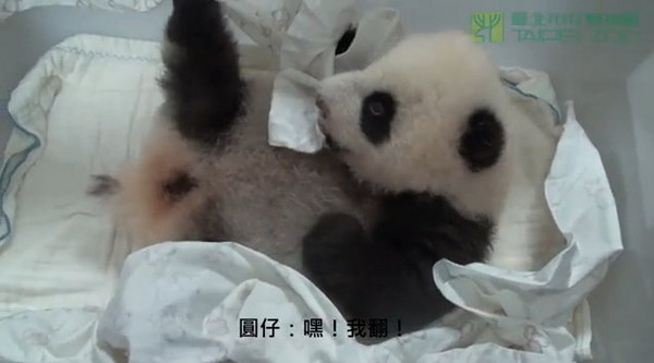 圆仔现在已经自行成功翻身几次,但成功率并不高。园方表示,大熊猫宝宝通常在3至4个月大的阶段,活动都必须靠妈妈帮忙,约4个多月大时,就可以渐渐开始自行正常活动。有些大熊猫宝宝在1、2个月大时就会自行翻身,但也有比较慢一点的。