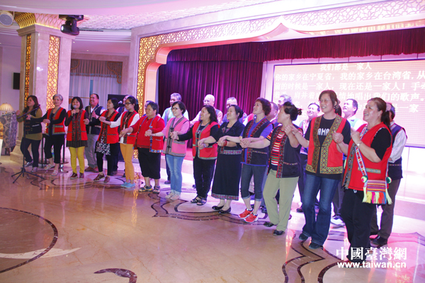 19日,来自台北、高雄等地的40多名台湾少数民族代表和企业界人士今日在宁夏银川与在宁台商台企代表欢聚联谊,共度中秋佳节。图为少数民族团员携手演唱歌曲《我们都是一家人》。(中国台湾网 普燕 摄)