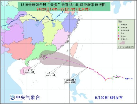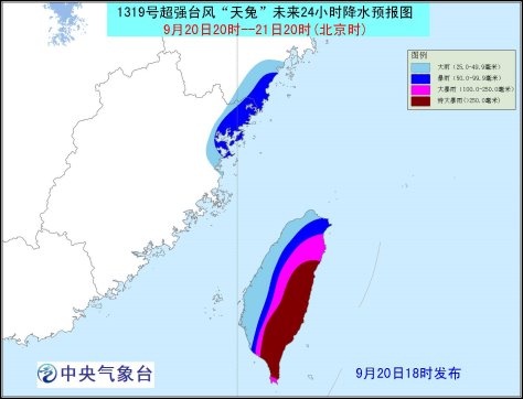 受“天兔”及其外围云系影响,20日20时至21日20时,巴士海峡将有12至14级大风,“天兔”中心经过的附近海面风力15至17级,阵风可达17级以上;台湾海峡、台湾以东洋面、台湾南部沿海有9至11级大风,阵风可达12至13级;我国钓鱼岛附近海域以及东海南部、台湾北部海面、南海东北部以及台湾东部沿海、福建中南部沿海有7至9级大风,阵风可达10至11级。浙江东南部、福建东北部、台湾等地部分地区有大到暴雨,其中台湾中东部部分地区有大暴雨,局地有特大暴雨(250至400毫米)。