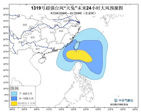 中国台湾网9月20日消息 中央气象台20日18时发布台风橙色预警,今年第19号超强台风“天兔”中心20日17时位于台湾省鹅銮鼻东南方约410公里的西北太平洋洋面上(北纬19.8度、东经124.1度),中心附近最大风力17级(60米/秒),中心最低气压915百帕,七级风圈半径380公里,十级风圈半径150公里。综合台湾媒体报道,台湾有关县市高度重视,严阵以待。截止20日晚间,台中、高雄、台东、屏东等10县市决定21日全天停班停课。岛内天气风险管理公司提醒,“天兔”结构相当完整,中心气压极低,加上适逢大潮,高雄、屏东等地应注意防范“风暴潮”。
