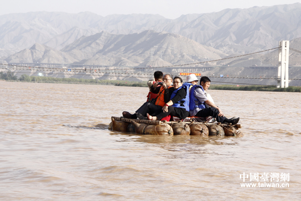 团员们乘坐黄河边上最古老的运输工具——羊皮筏子沿黄河顺流而下,与黄河亲密接触。(中国台湾网 普燕 摄)