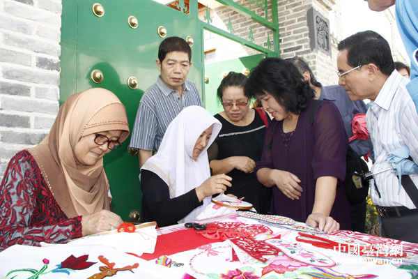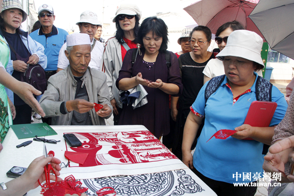 交流团成员观看回族民间剪纸表演并获赠剪纸礼物。(中国台湾网 普燕 摄)