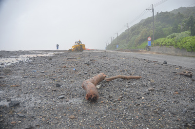 天兔台风过境,台东大武乡21日风强雨大,大浪夹着漂流木、礁石打上南回公路,公路宛如碎石路,台当局“公路总局”封闭公路清除。(图片来自台媒)