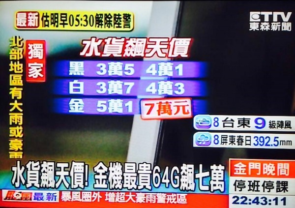 iPhone5S水货落地台湾,64G金色版开出天价。(图片来自东森新闻)