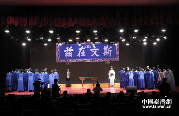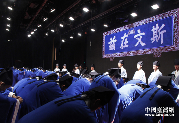 28日,北京市第六届中华文化快车——2013年两岸青少年中华国学文化课堂交流活动在北京四中举行。来自北京和台湾的中小学师生代表700余人齐聚一堂,开展祭拜孔子仪式、国学礼仪短剧表演、专家国学讲座等活动。图为祭拜孔子仪式现场。(中国台湾网 普燕 摄)