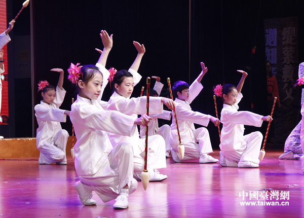 来自北京市西城区小学校的同学们表演毛笔操,展示国学文化。(中国台湾网 普燕 摄)