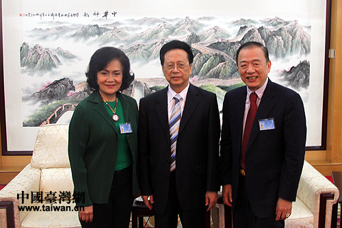 全国人大副委员长、中国和平统一促进会副会长陈昌智(右)会见泰国中国和平统一促进会总会访问团名誉团长王志民(左)。(中国台湾网 马迪 摄)