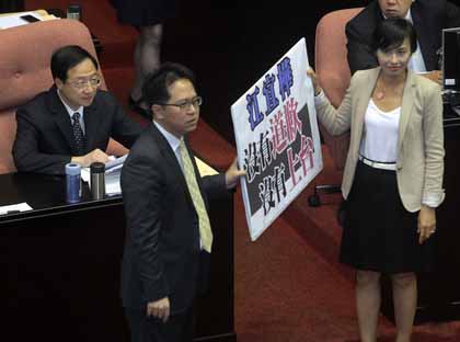中国台湾网10月4日消息 台湾“行政院长”江宜桦4日第五度赴台“立法院”作施政报告并备询。但因在野民进党“立法委员”阻挠,江宜桦仍无法上台。在炮声隆隆中,江宜桦枯坐台下,面无表情地处理公文。