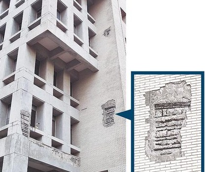 台湾政大行政大楼是海砂屋,让学生人人自危;图为大楼外墙磁砖剥落露出钢筋。(图片来自台媒)