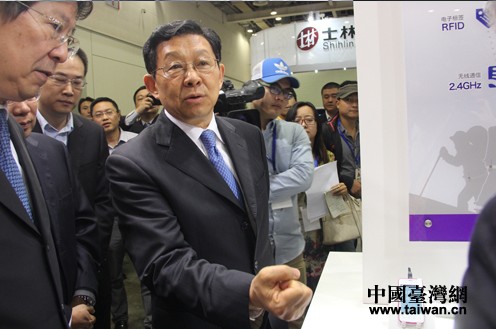 开幕式结束后,领导和嘉宾进入展厅参观展会。图为海协会会长陈德铭在台企旺宏电子展台前参观。(中国台湾网 王怡然 摄)