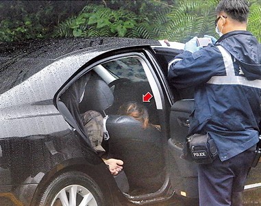五分埔徐姓富商(后座者)疑走不出丧妻之痛,偕新婚妻(箭头处)于车上烧炭双亡。(台媒图)