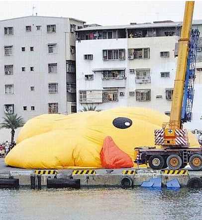 中国台湾网10月23日消息 据台湾“中央社”报道,小黄鸭26日将在桃园县展出,今(23)天清晨5时45分进行小鸭充气试游,只见鸭身不断变大,让工作人员与记者感到兴奋。