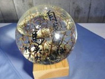 中国台湾网10月25日消息 据台湾媒体报道,李登辉下乡之旅今天来到宜兰一间著名的休闲农场参观,农场主人徐主雄还曾荣获得2009年十大神农奖。可就在媒体拍摄时,赫然发现大门口放着一颗“生态球”,玻璃上面清晰可见马英九题写的四个大字“自求多福”,旁边还有马英九的签名及日期。